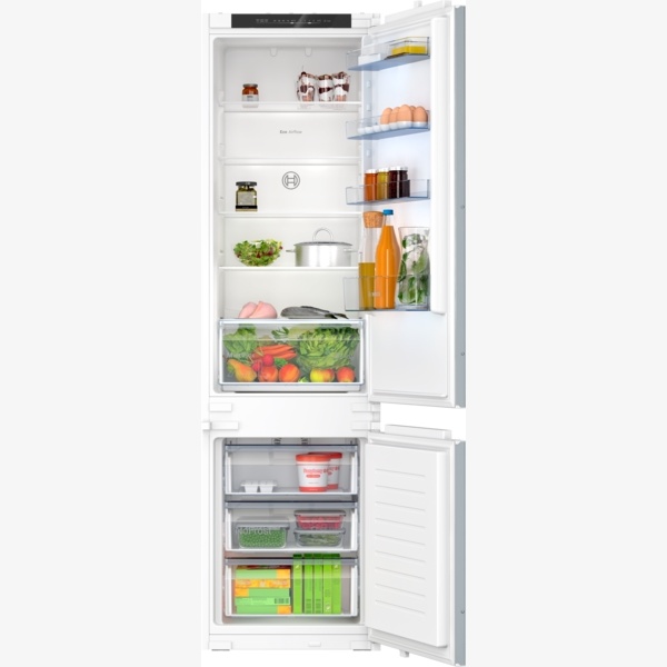 The Series 2 KIN96NSE0G is an extra large built–in XL fridge–freezer offering 11% more storage volume in a taller design. With a total volume of 290 l, it features a spacious MultiBox XXL drawer for fruit and vegetables, No Frost technology in the freezer and Eco Airflow for constant temperature throughout the cooling area. Quiet 34 dB operation and integrated installation make it suitable for a calm, modern kitchen.