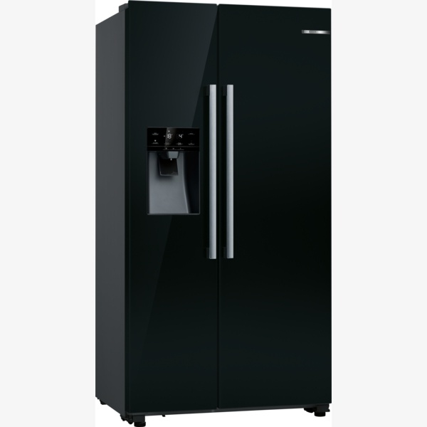 The Bosch Series 6 KAD93ABEP is a freestanding American-style side-by-side fridge-freezer in black gloss with Total No Frost. It offers a total net volume of 562 l, with separate temperature control for fridge and freezer, bright LED lighting and MultiAirflow for improved air circulation. An illuminated water and ice dispenser with automatic ice maker and internal water filter provides ice cubes and chilled water whenever needed, while Super Cooling and SuperFreezing protect newly stored food.