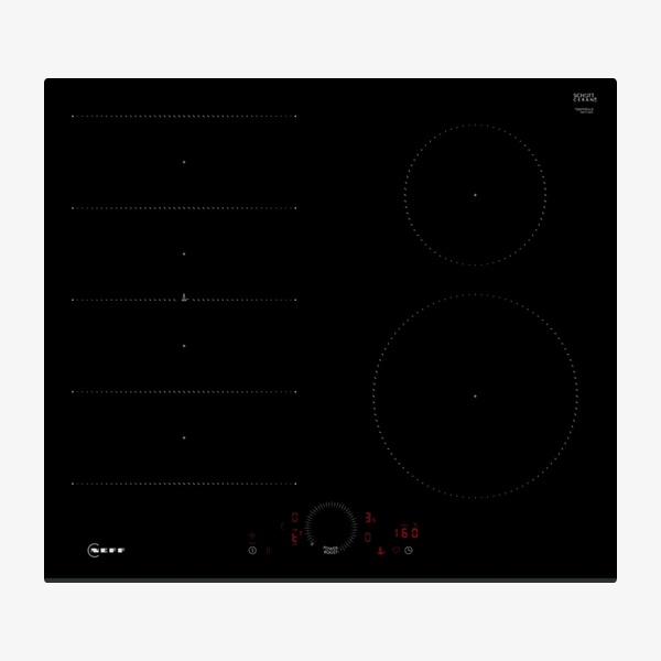 The N 70 T66FHE4L0 is a 60 cm built-in induction hob offering space for 4 pots or pans and flexible cooking zones. It features Twist Touch® control, Flex Induction for versatile cookware placement, and Home Connect for remote monitoring and smart functions. With Power Boost, Extended Frying Sensor, Dish assistant and multiple safety features, it is designed for convenient, precise and connected everyday cooking. Surface colour is black with a bevelled front edge.