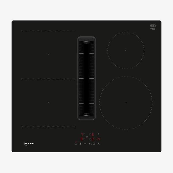 The N 50 V56NBS1L0 is a 60 cm frameless induction hob with a fully integrated high-performance downdraft ventilation system, combining two appliances in one for a clear view while cooking. It offers four induction cooking zones, including a combi zone for larger cookware, touch control with 17-stage power settings, and powerful extraction with reduced noise. Easy-clean, dishwasher-safe filters and flexible ducted or recirculated installation options support convenient everyday use.