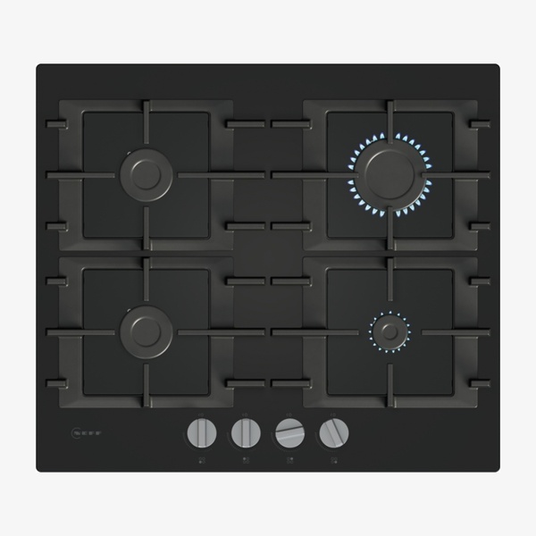 This 60 cm N 50 gas hob in black tempered glass (model T26Nkp4s0) is a built-in appliance with four burners and front sword dials for easy, enjoyable control. Cast iron pan supports with rubber feet offer high stability and are suitable for dishwashers, helping to simplify cleaning. A flame failure safety device cuts off gas if the flame goes out, and the hob is biomethane ready, allowing use with renewable biomethane gas.