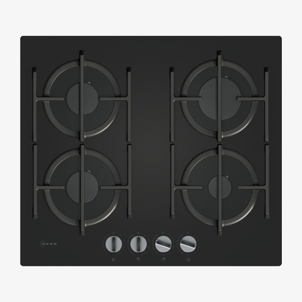 The N 70 T26PIP4S0 is a 60 cm built-in gas hob with a black tempered glass surface and four burners. Designed for convenient front control, it offers FlameSelect® with nine flame levels for precise cooking. Cast iron pan supports with rubber feet provide stability and are suitable for dishwashers, while removable metallic sword dials simplify cleaning. Gas safety cut-off and compatibility with renewable biomethane gas support safe, modern gas cooking.