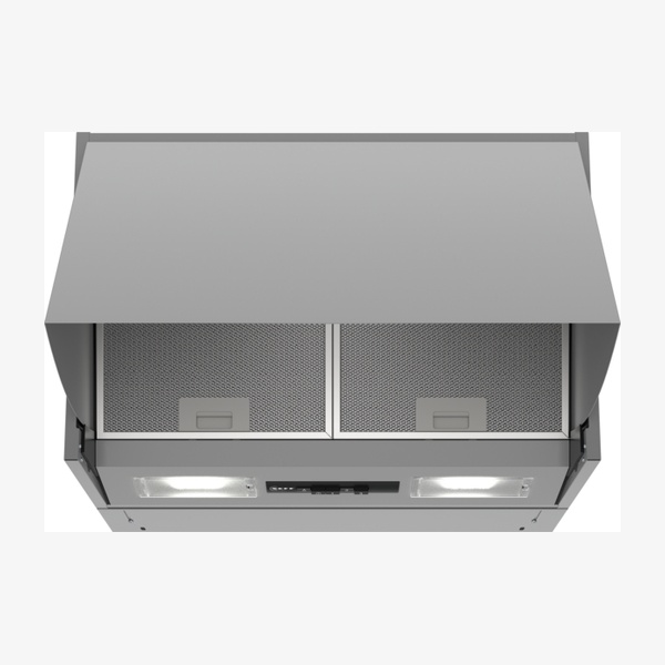 The N 30 integrated 60 cm silver cooker hood D64MAC1X0B is a built–in, wall–mounted hood designed to be discreetly hidden within upper cupboards with a hinged, fold out unit. It offers up to 625 m³/h extraction with three power levels, mechanical push button controls and clear LED lighting. Suitable for both ducted extraction and recirculation with washable aluminium grease filters, it provides efficient odour and grease removal for everyday cooking.