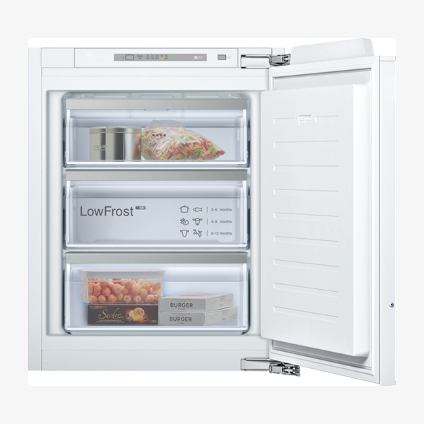 This built–in Neff N 50 GI1113FE0 upright freezer offers a 72 l net capacity in a compact 71.2 cm high, 55.8 cm wide appliance designed for integration into kitchen furniture. It features Low Frost technology for less ice build–up and faster defrosting, a SuperFreeze function with automatic deactivation and both optical and acoustical malfunction warning signals. With manual defrost, three freezer drawers and an included ice cube tray, it combines organised storage with efficient performance.