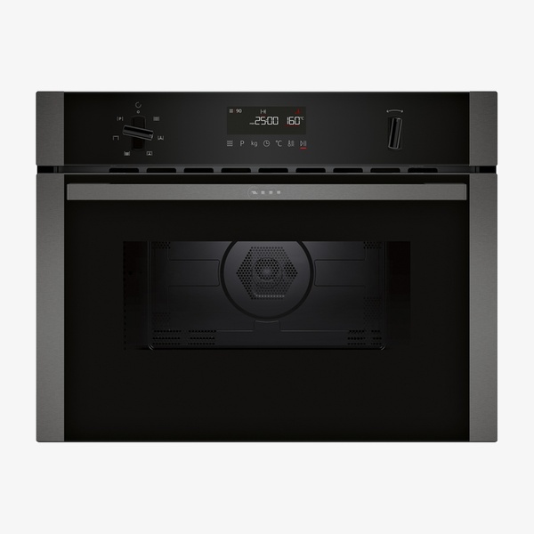 The N 50 C1AMG84G1B is a 45 cm high built-in combination microwave oven in Graphite-Grey, designed for defrosting, reheating and preparing dishes. It offers microwave, hot air, Circo-roasting, full surface grill and keep warm functions, with a 44 l cavity and up to 900 W microwave power. User-friendly electronics, LCD display and retractable dials support easy control, while Easy Clean and a ceramic glass base aid quick cleaning.