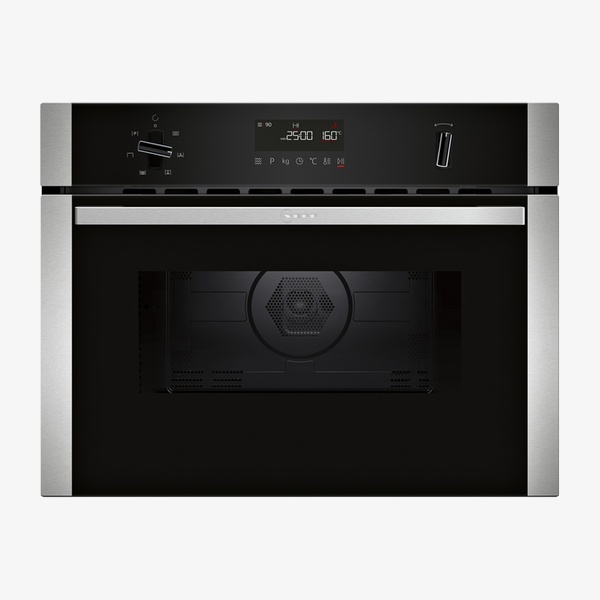 The N 50 C1AMG84N1B is a 45 cm high built–in combination microwave oven in stainless steel, designed for defrosting, reheating and preparing dishes. It offers microwave, hot air, Circo–roasting, full surface grill and keep warm functions, with intuitive control dials and one–touch buttons. Easy Clean makes interior cleaning quick, while the LCD display with large characters supports straightforward operation in modern built–in kitchen layouts.