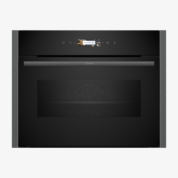 The C24MR21G0B N 70 built–in compact oven with microwave combines a 45 litre oven and powerful 900 W microwave in a 60 x 45 cm graphite–grey design. It is suitable for fitted kitchens where space saving and flexibility are important. With 17 heating methods, intelligent inverter technology, Home Connect capability and EasyClean, it offers convenient, controlled cooking and gentle heating in a modern compact format.