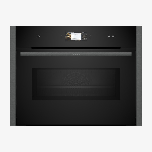 The Neff N 90 C24MS71G0B is a graphite-grey compact built-in oven with microwave function designed for fast, convenient cooking in limited spaces. It combines a 45 litre oven with a 900 W microwave and 21 heating methods, including 4D Hot air and full surface grill. With HomeConnect on WLAN, a 4.1-inch Full Touch TFT Display, intelligent inverter technology and pyrolytic self-cleaning with EasyClean, it offers flexible cooking and easy maintenance.
