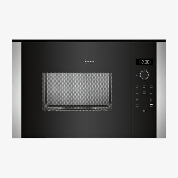 The N 50 HLAWD53N0B is a built-in black microwave oven designed to coordinate with N50 ovens and suit elevated installation thanks to its side-opening hinged door. It offers up to 900 W microwave power, seven automatic programmes and a 25 l stainless steel cavity. Intuitive control dials, one-touch buttons, a white LED display and bright LED lighting support straightforward operation in a modern kitchen setting.