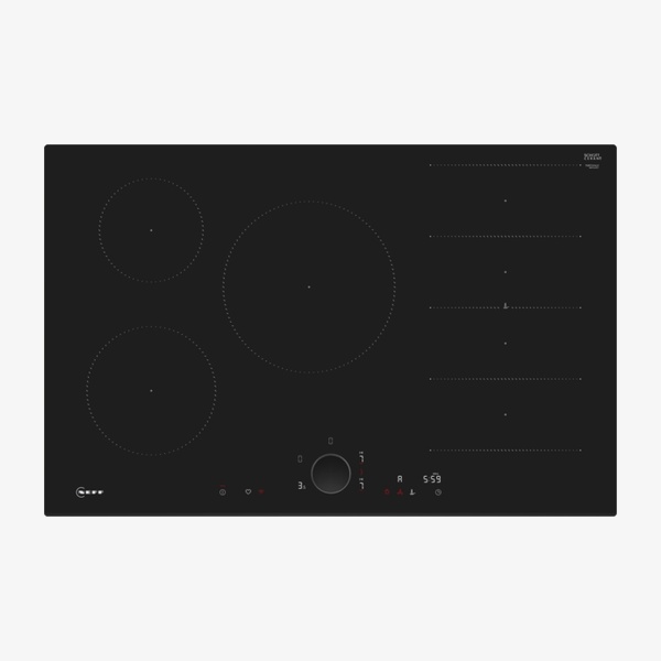 The N 90 T68FUV4L0 is an 80 cm built-in Flex Induction hob designed for surface mounting without a frame, offering space for five pots or pans. It features a removable Twist Pad® control knob, flexible induction cooking zones and intuitive Flex Zones that detect cookware size, shape and position. With Home Connect, Smart Hood Automatic, multiple power levels and time-saving functions such as Power Boost, it suits users seeking precise, convenient electric induction cooking.
