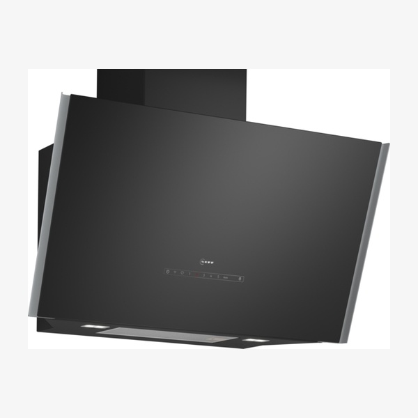 This 90 cm N 90 wall–mounted cooker hood in black clear glass offers angled glass design with front and bottom capture areas for effective extraction. It is suitable for both ducted extraction and recirculation, with optional kits available. Featuring an Efficient Drive BLDC motor, Automatic Air Sensor and Home Connect control, it combines strong extraction performance with adjustable LED softLight illumination and convenient cleaning access.