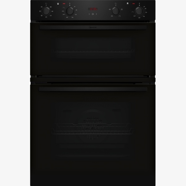The N 30 U1DCC0AK3B is a built–in double oven designed for flexible grilling, baking and roasting. With a 71 litre main oven and 34 litre top oven, it offers multiple heating methods including CircoTherm® smart hot–air for baking on up to three levels at once. A clear red LED display, elongated dials with steel trim and full glass inner doors support straightforward operation, while included combination grids and a universal pan provide practical cooking options.