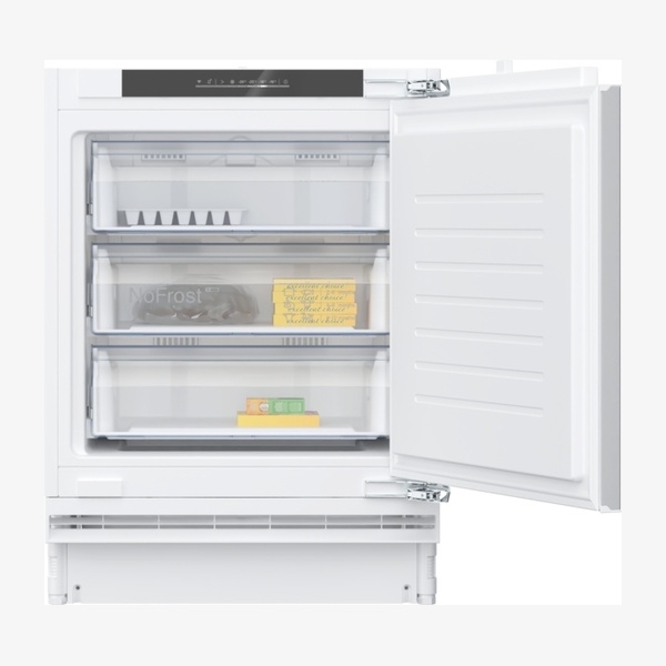 The Neff N 50 GU7212FE0G is a fully integrated built-under upright freezer designed for spaces with an 82 cm niche height. It offers an 85 l net freezer volume with three drawers, No Frost technology and automatic defrost for convenient, worry-free freezing. With electronic LED control, SuperFreeze function and optical and acoustical warning signals, it supports reliable food storage. Home Connect enables remote diagnostics, monitoring and control, while reversible flat hinges suit varied kitchen layouts.
