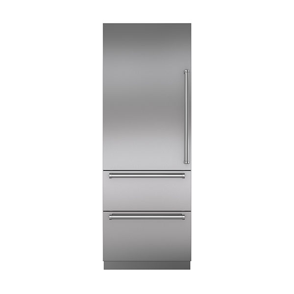The ICBDET3050CIID is a 76 cm designer over-and-under refrigerator/freezer that accepts custom panels for an integrated, panel-ready look. It offers an internal water dispenser, automatic ice maker and Split Climate™ intelligent cooling to help keep food fresher for longer. ClearSight™ LED lighting illuminates the interior, while adjustable shelves, drawers and door bins provide flexible storage. Stainless-steel accents and touch controls combine convenience with a sophisticated finish.